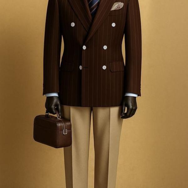 A premium mocha brown pinstripe double-breasted jacket paired with contrasting sand-beige trousers for a sophisticated, modern executive look.