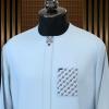 A refreshing, contemporary take on the classic Senator suit. This tunic is crafted from ultra-smooth, breathable sky blue cotton-poly blend fabric. It features a minimalist hidden-placket design accented by distinctive "pixel-art" geometric embroidery in black, white, and red. The digital-inspired pattern is elegantly placed on the pocket square detail, the top collar button, and the base of the placket for a balanced, modern aesthetic.