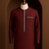 With its finely crafted construction and stunning colour, the burgundy Senator top commands attention from everyone in the room. It has been created specifically for the discerning Delta gentleman, and it is made of a beautiful, soft, deep wine-coloured wool blend fabric that will not lose its shape as a result of the rigours of everyday life and after a long night on stage. The placket features a silver-toned geometric embroidery detail that runs vertically down the top; the left pocket is embroidered with a matching square trim. The long-sleeved Senator top is finished with a clean finish, using a hidden button closure, and features a super stylish, round neck design that combines modern style with traditional culture.