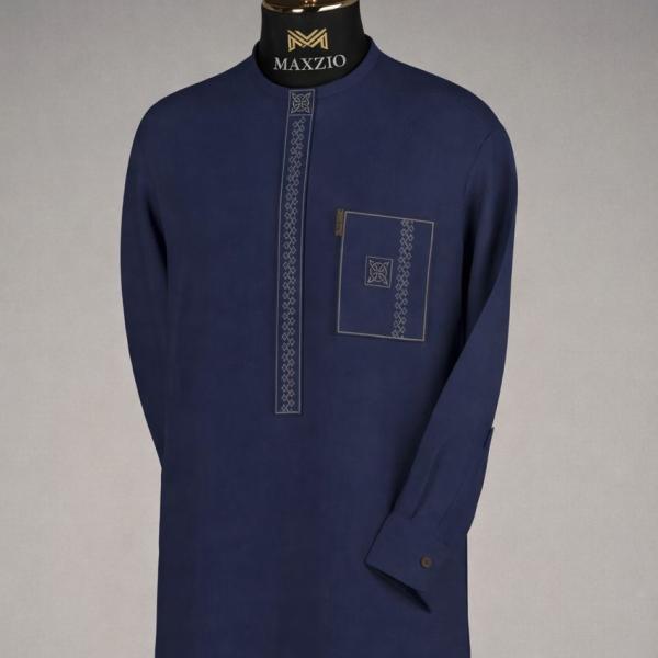 Take control of any space with the luxurious Midnight Blue Senator outfit from the Maxzio Signature collection. This long sleeve native outfit is made from high quality, densely woven, polished cotton giving it a luxurious matte feel that is very breathable and structured. The outfit includes an intricate vertical geometric embroidery pattern lining the hidden button placket, echoed with a signature embroidery symbol and trim on the operational breast pocket. It is a stunning representation of the fusion of Niger-Delta culture with 21st century professional style.
